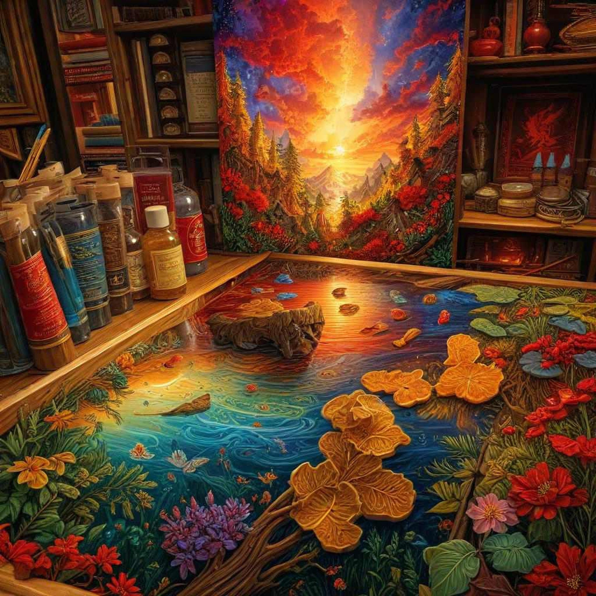 Based on a real photo of my studio, this piece turns the creative space into a dreamlike sanctuary. Brushes wait, colors awaken, and the light enters like a soul’s breath.