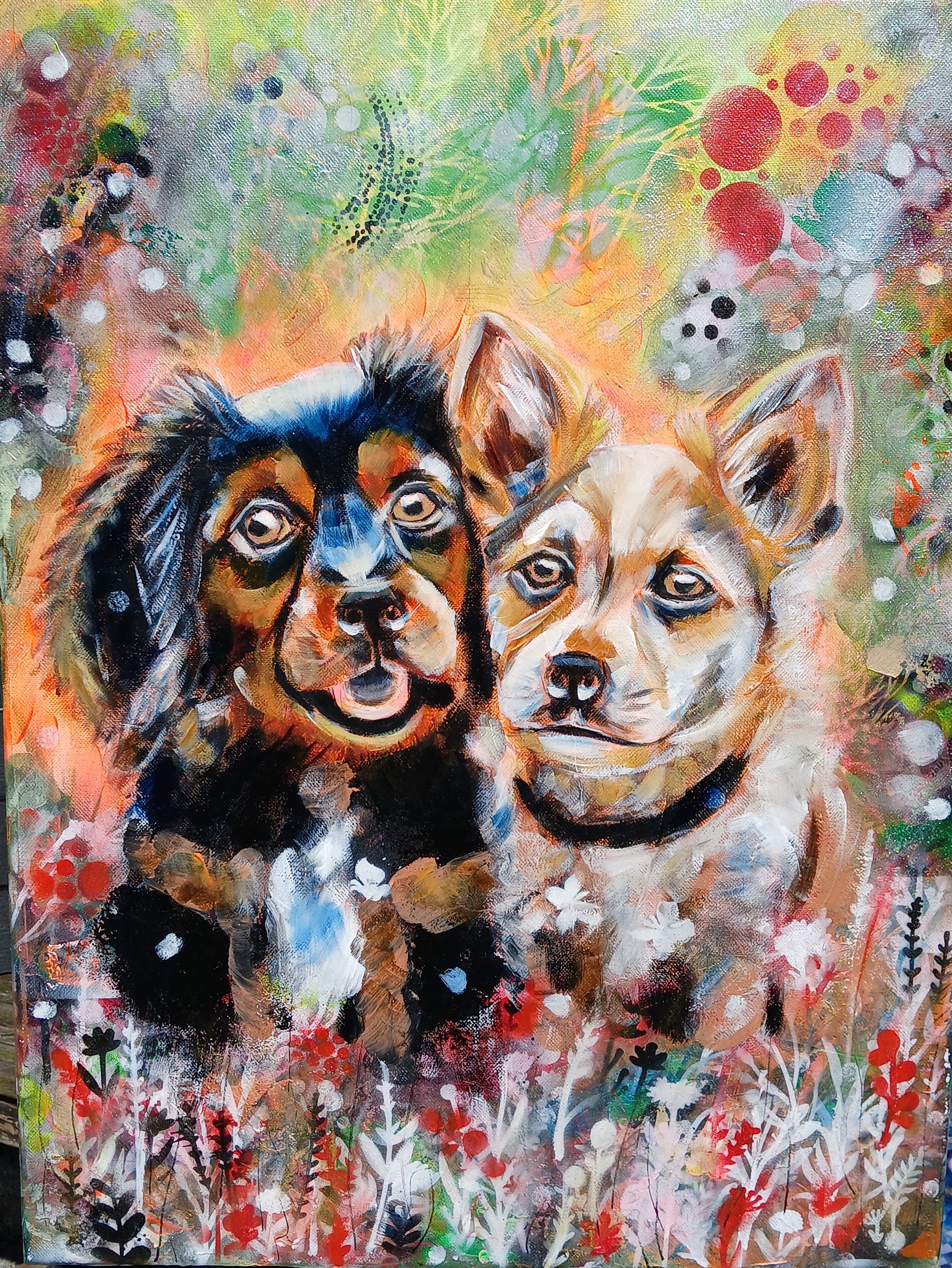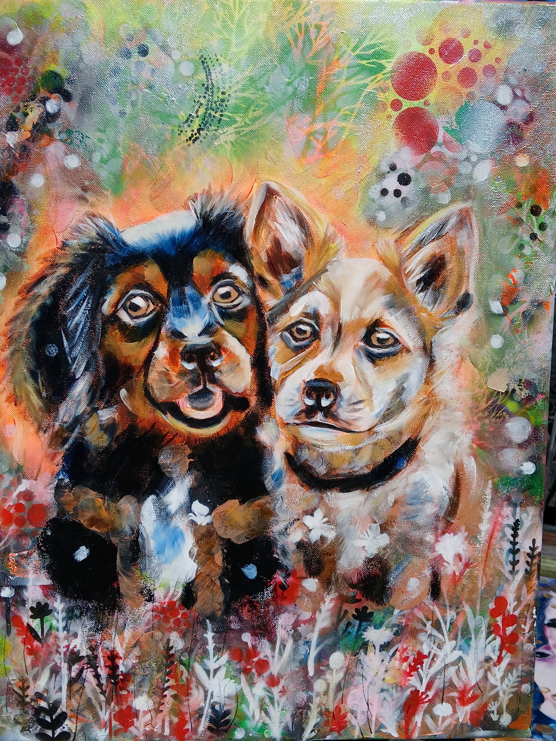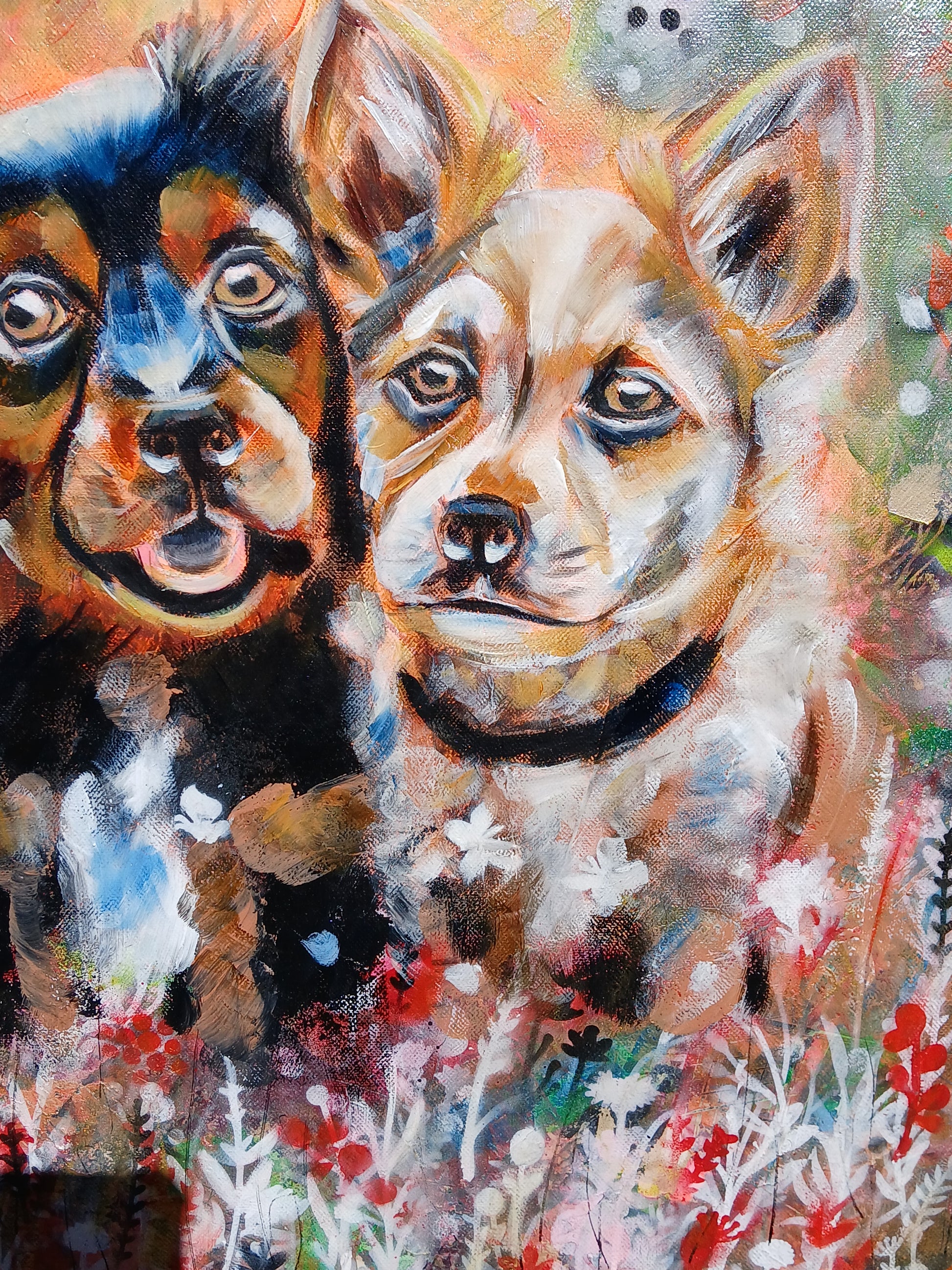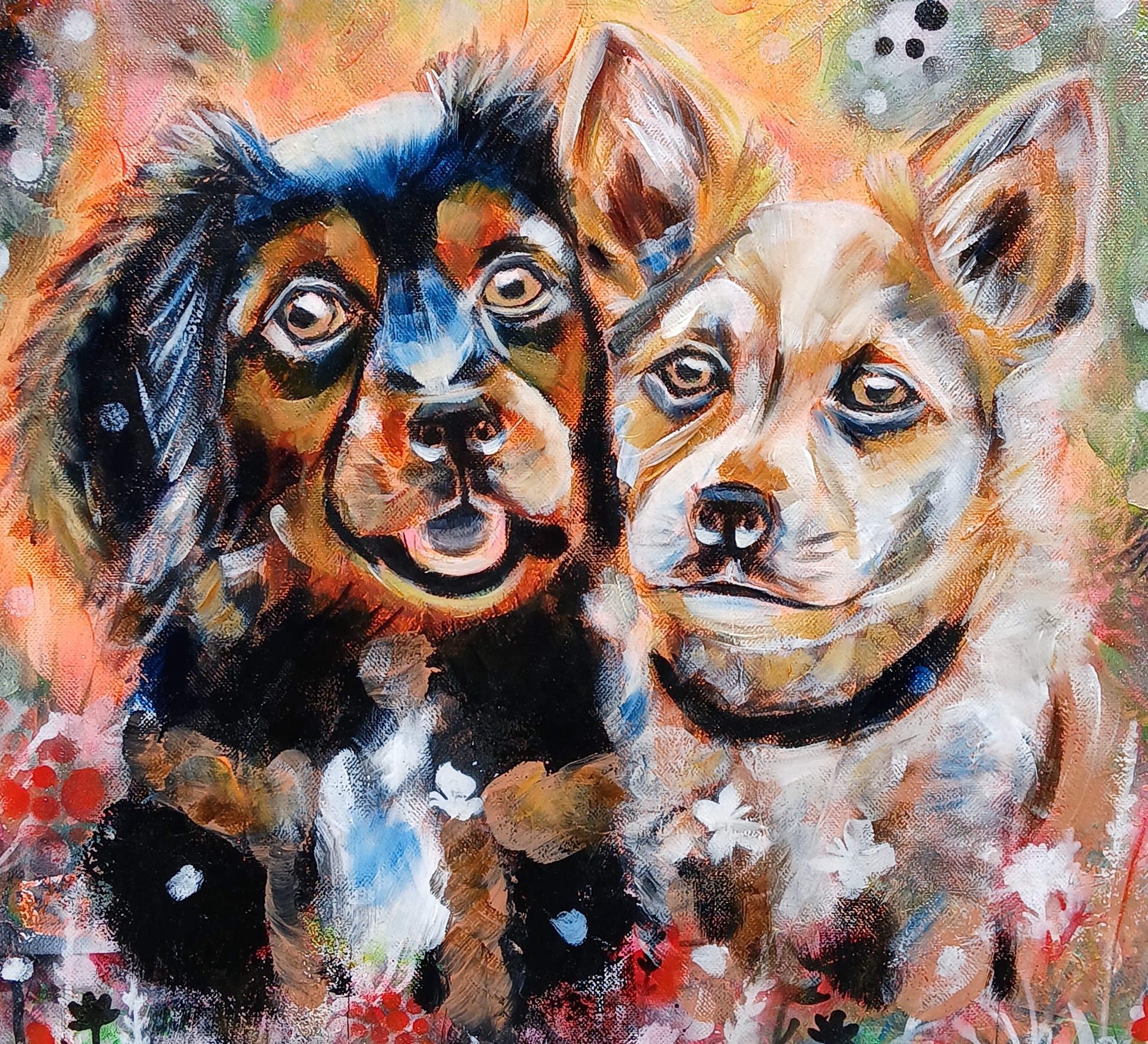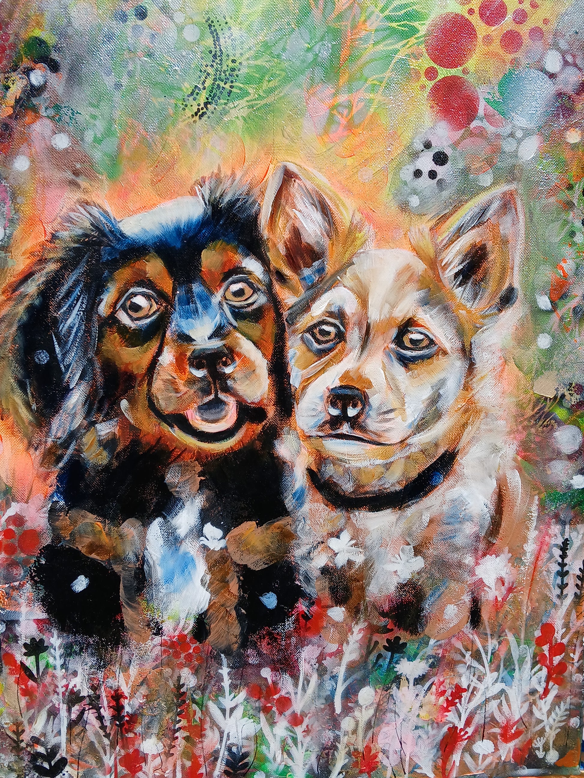 Deux regards pétillants d'affection et de complicité dans un éclat de couleurs et de textures vibrantes. Cette toile capture l’innocence et la joie pure des compagnons à quatre pattes, évoquant tendresse et joie de vivre.