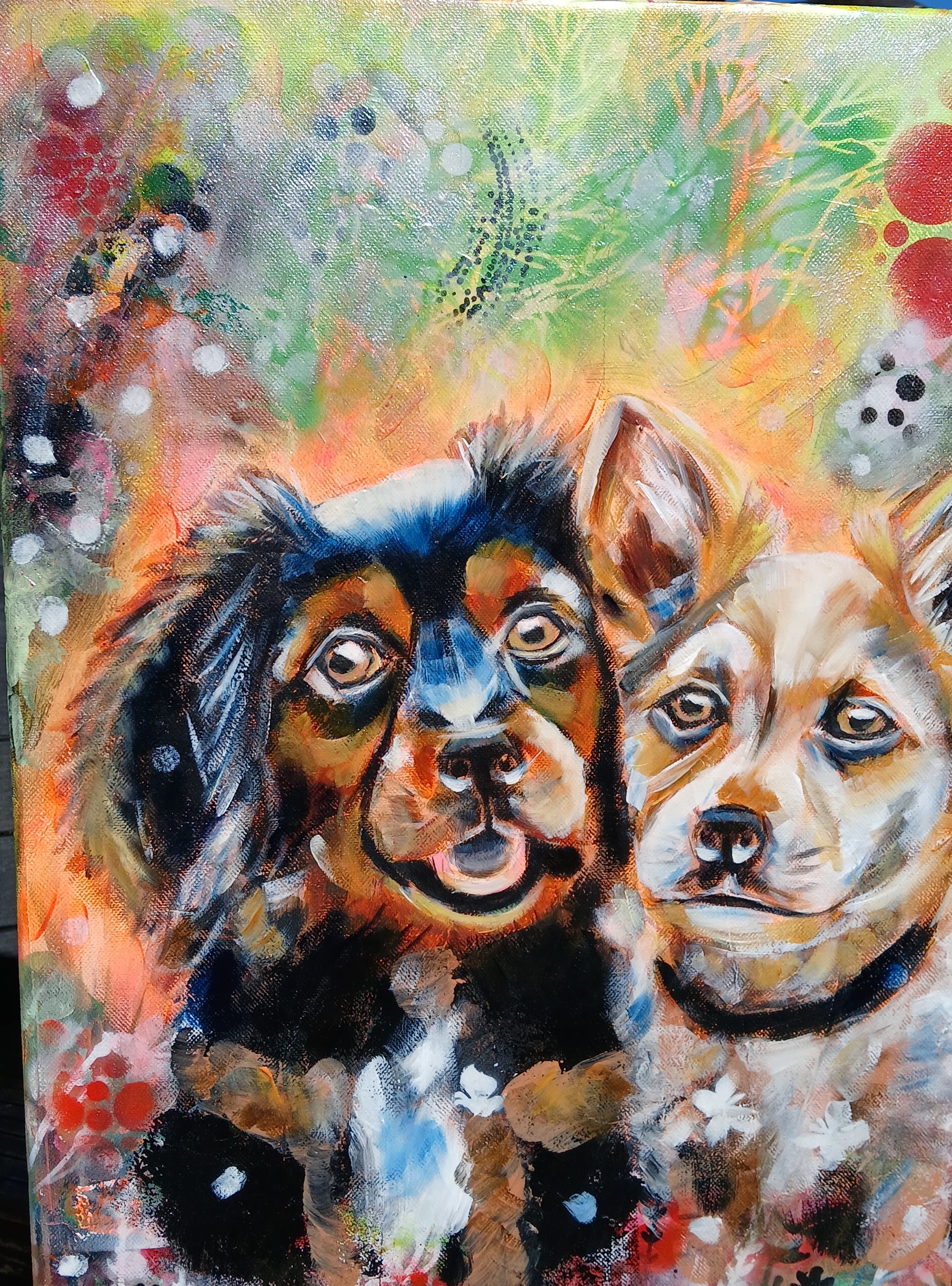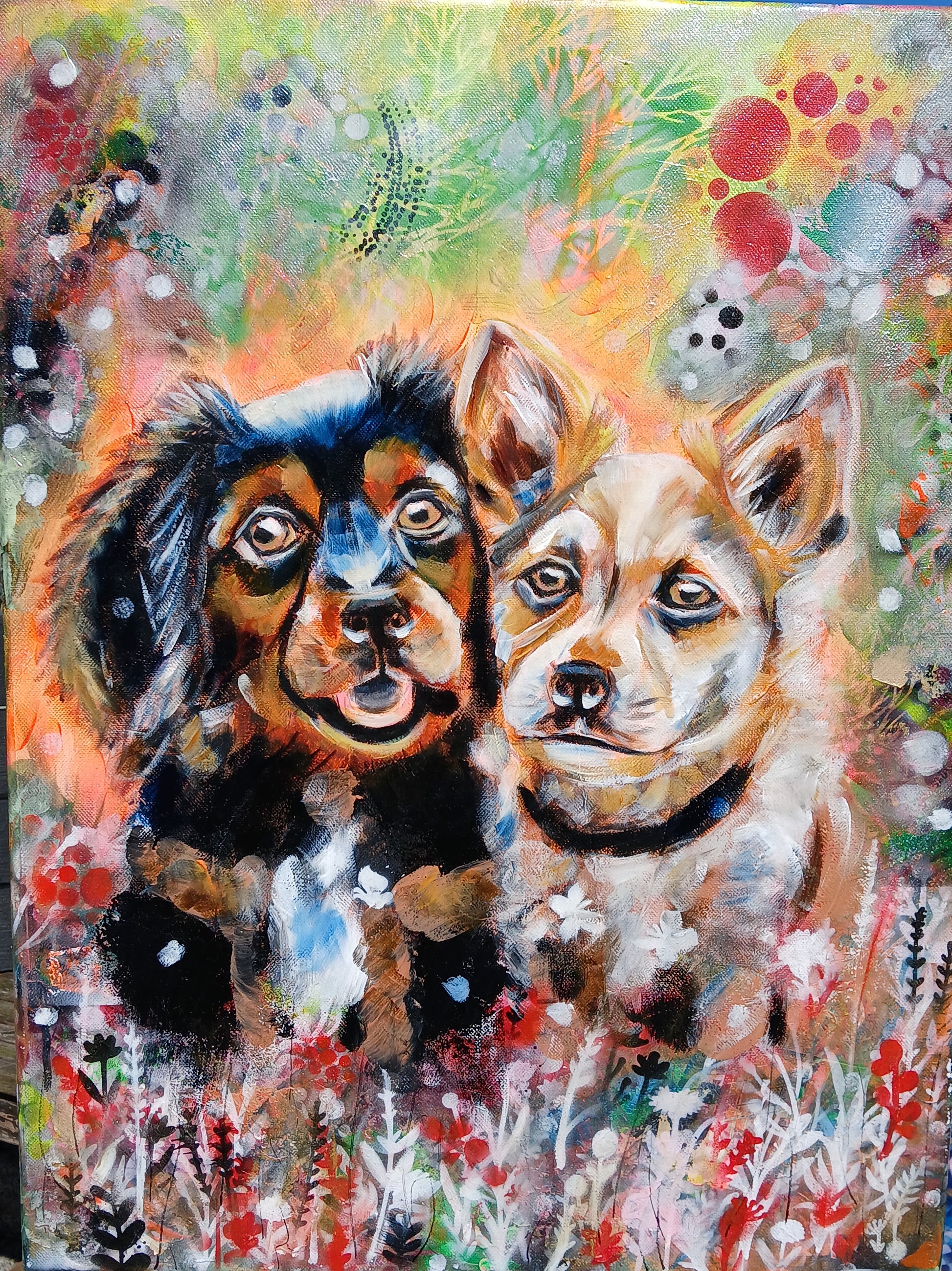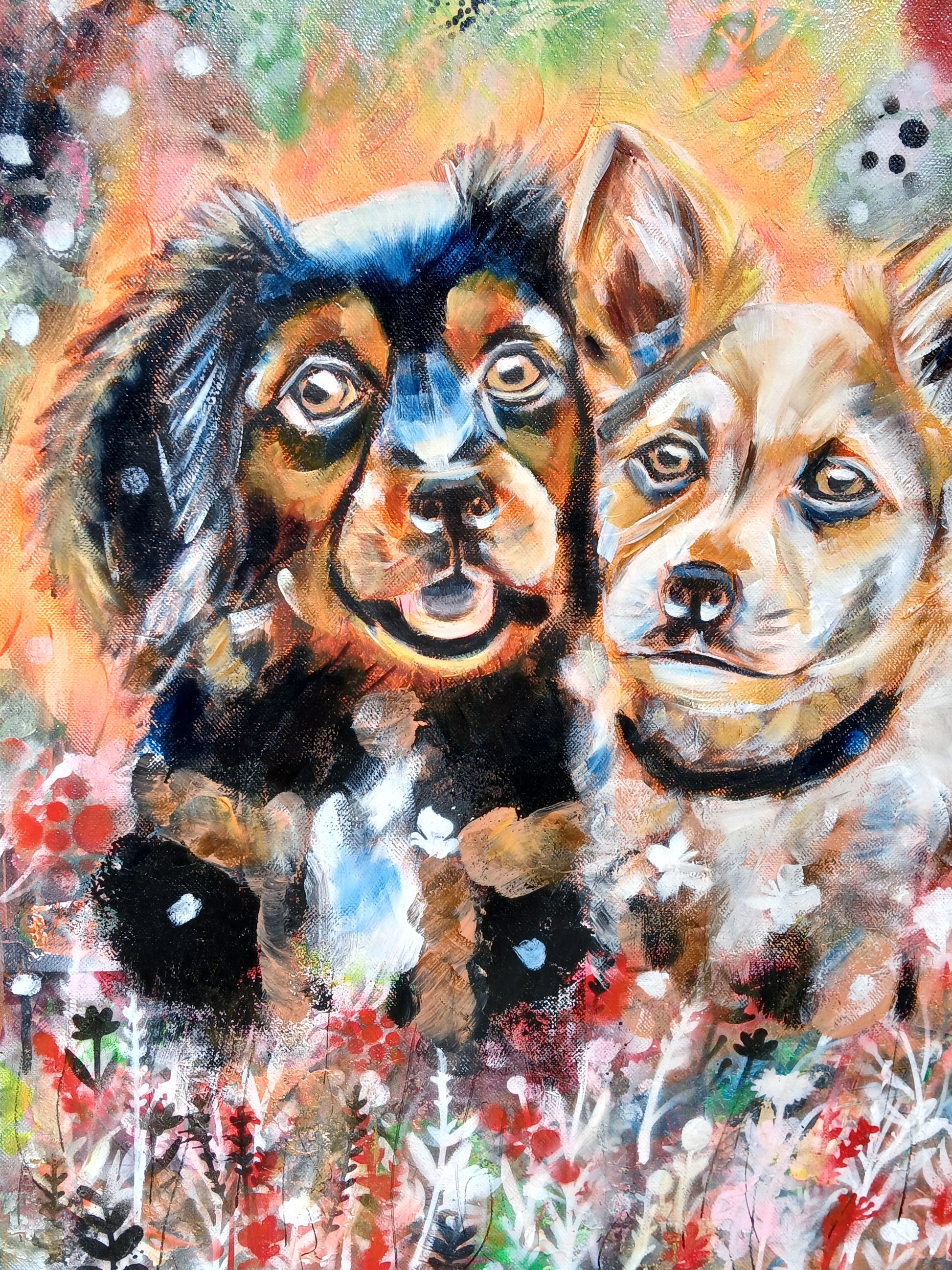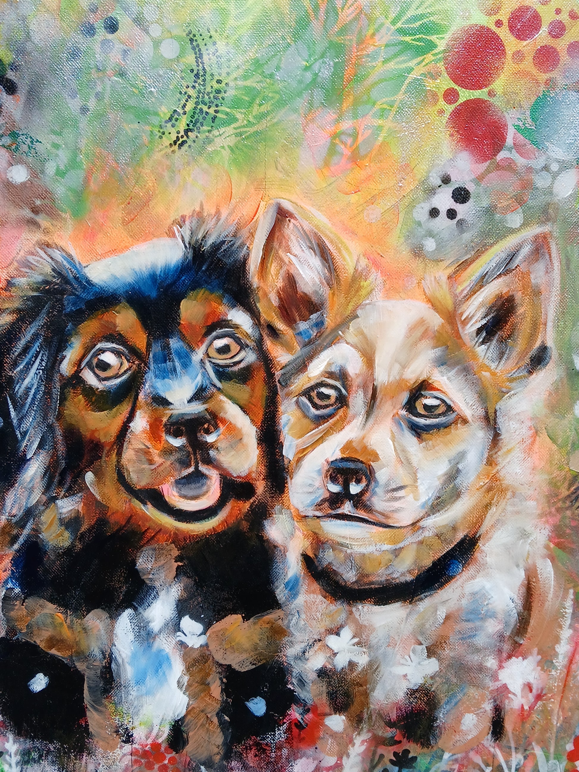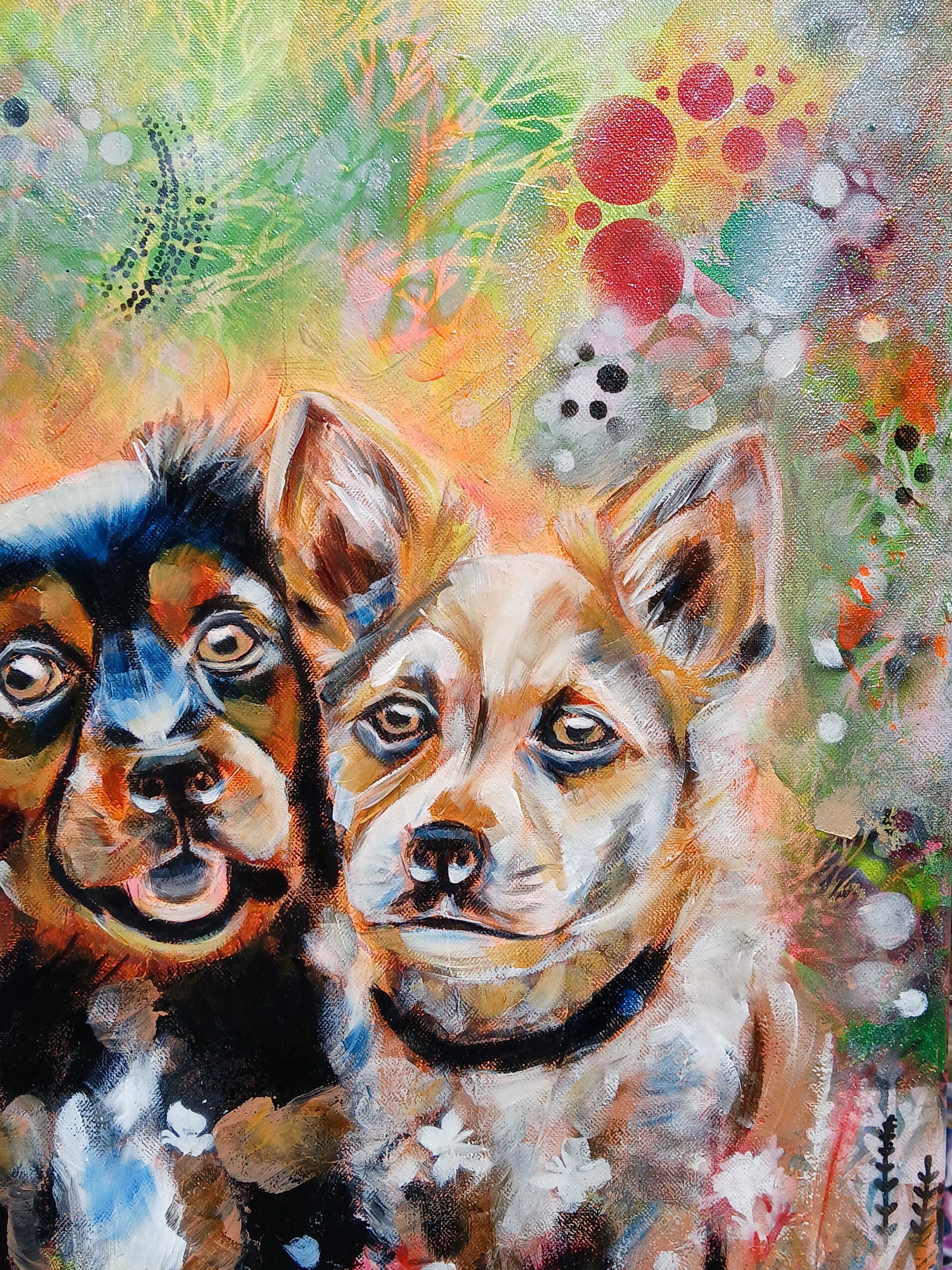 Deux regards pétillants d'affection et de complicité dans un éclat de couleurs et de textures vibrantes. Cette toile capture l’innocence et la joie pure des compagnons à quatre pattes, évoquant tendresse et joie de vivre.