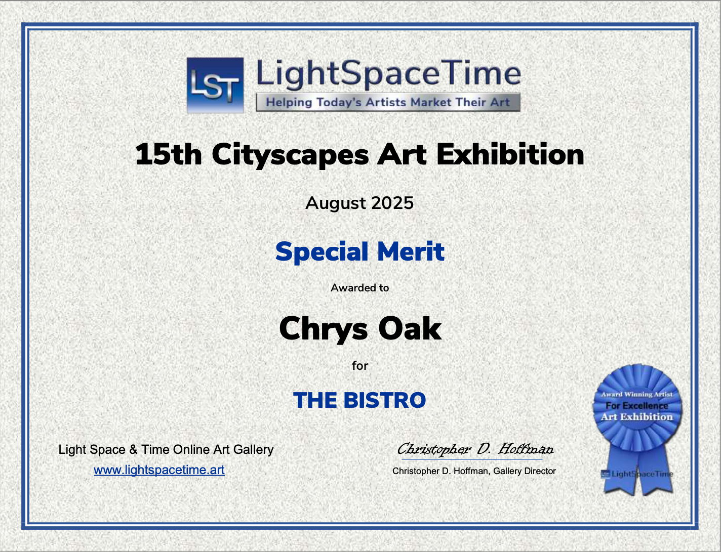 My painting "The Bistro" has been selected as a finalist in the Cityscapes International Exhibition – Light Space Time Gallery (August 2025).
