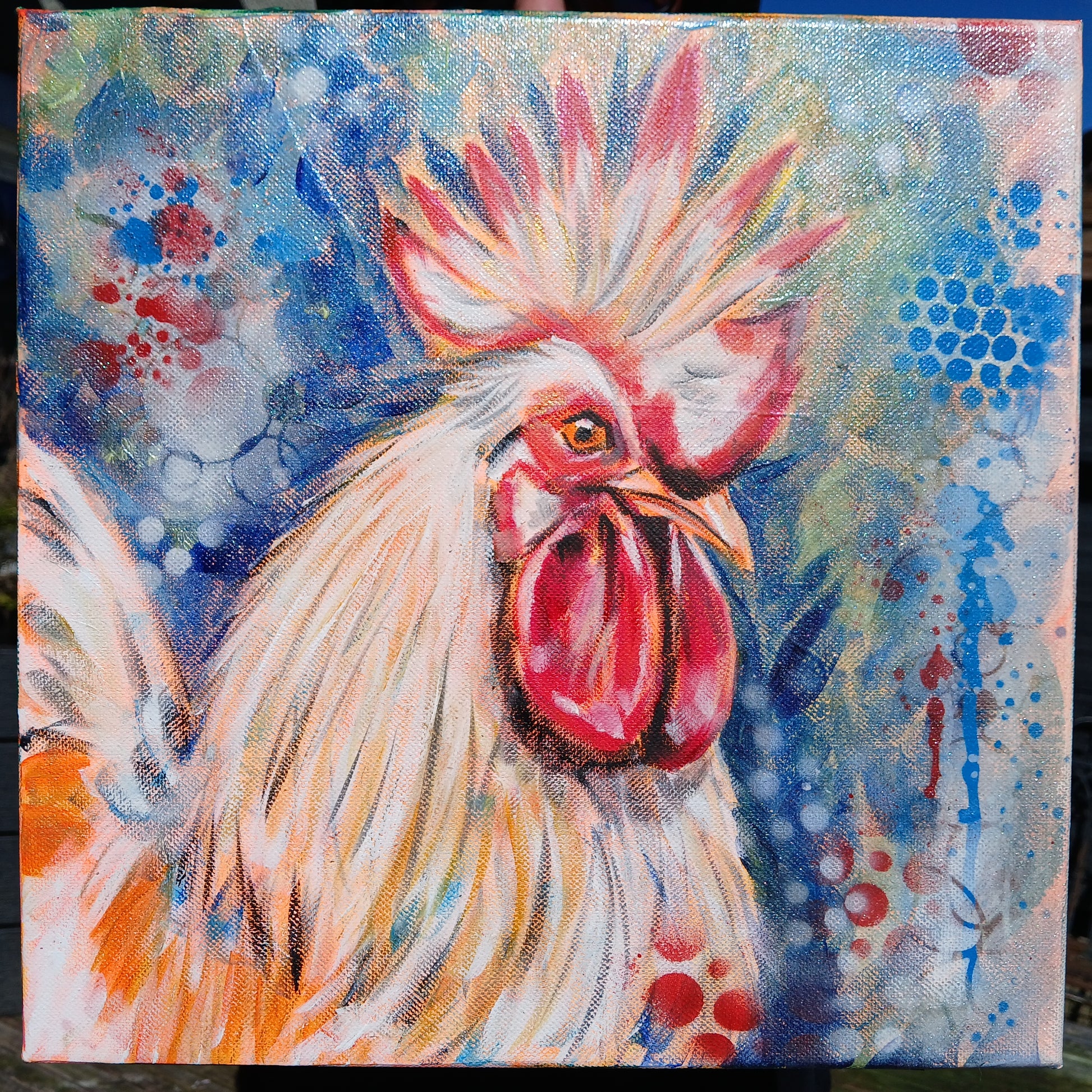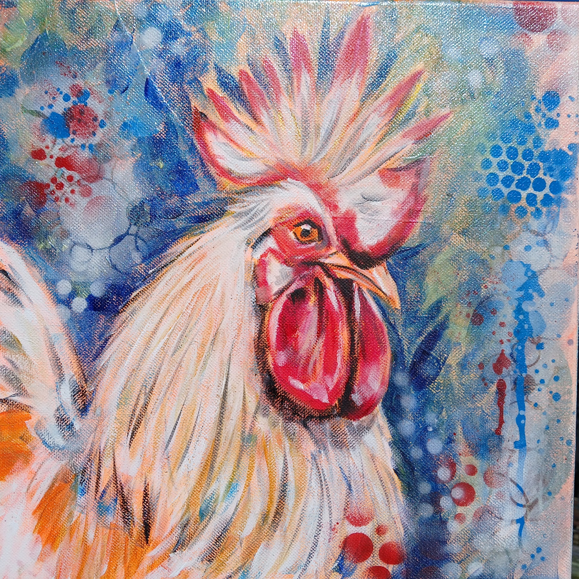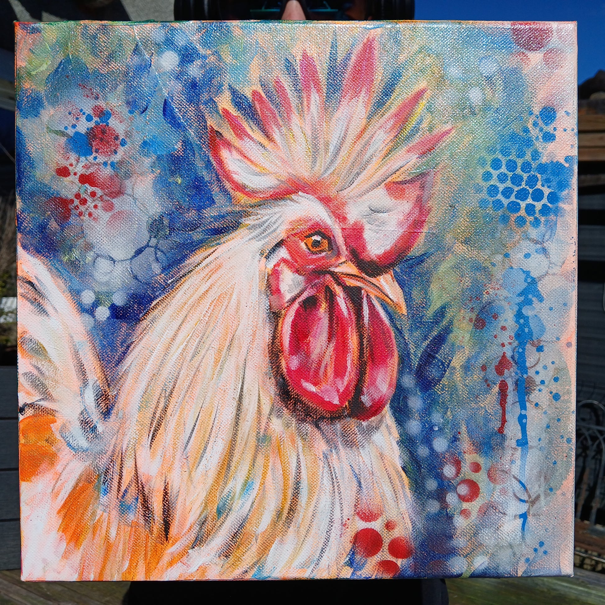 This painting is part of a limited series of 3 artworks titled Kings of the Barnyard.