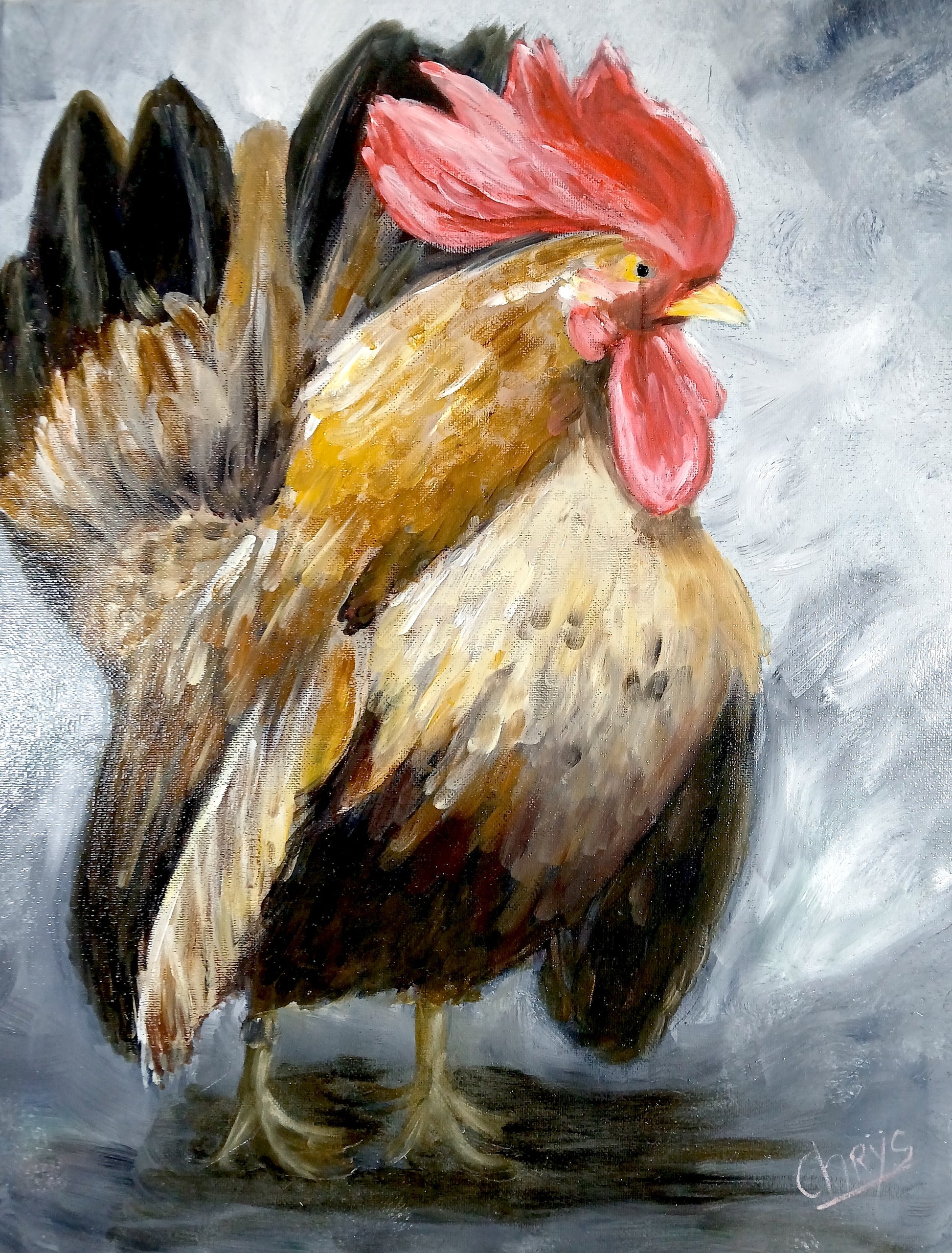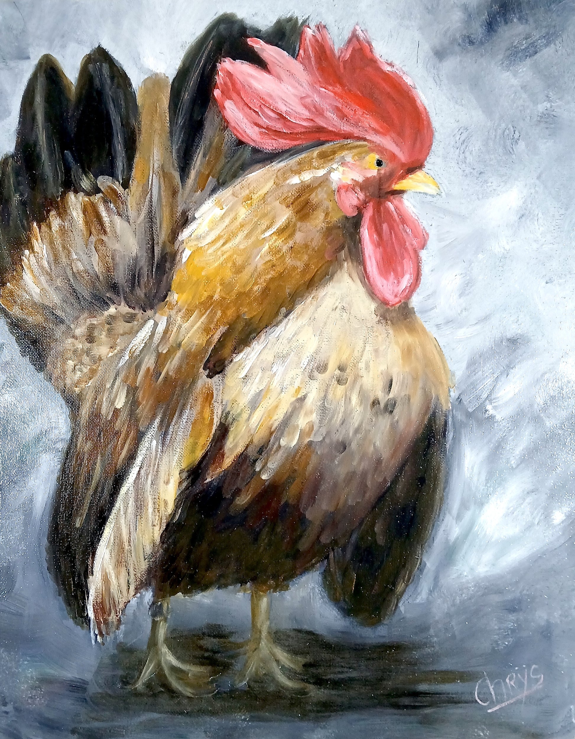 “Lulu the Valiant” pays tribute to a legendary rooster from the artist’s farm — proud, radiant, and full of character.