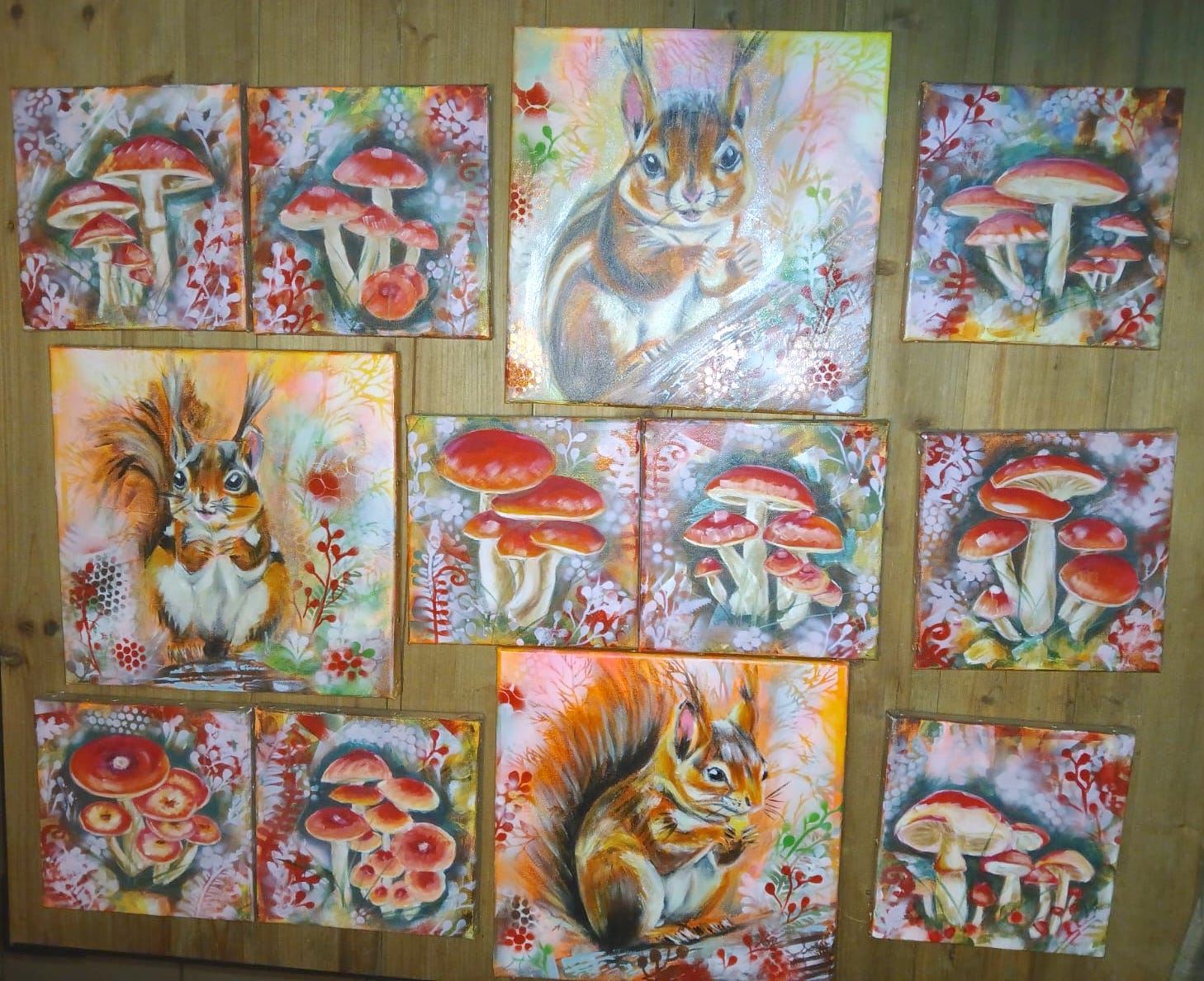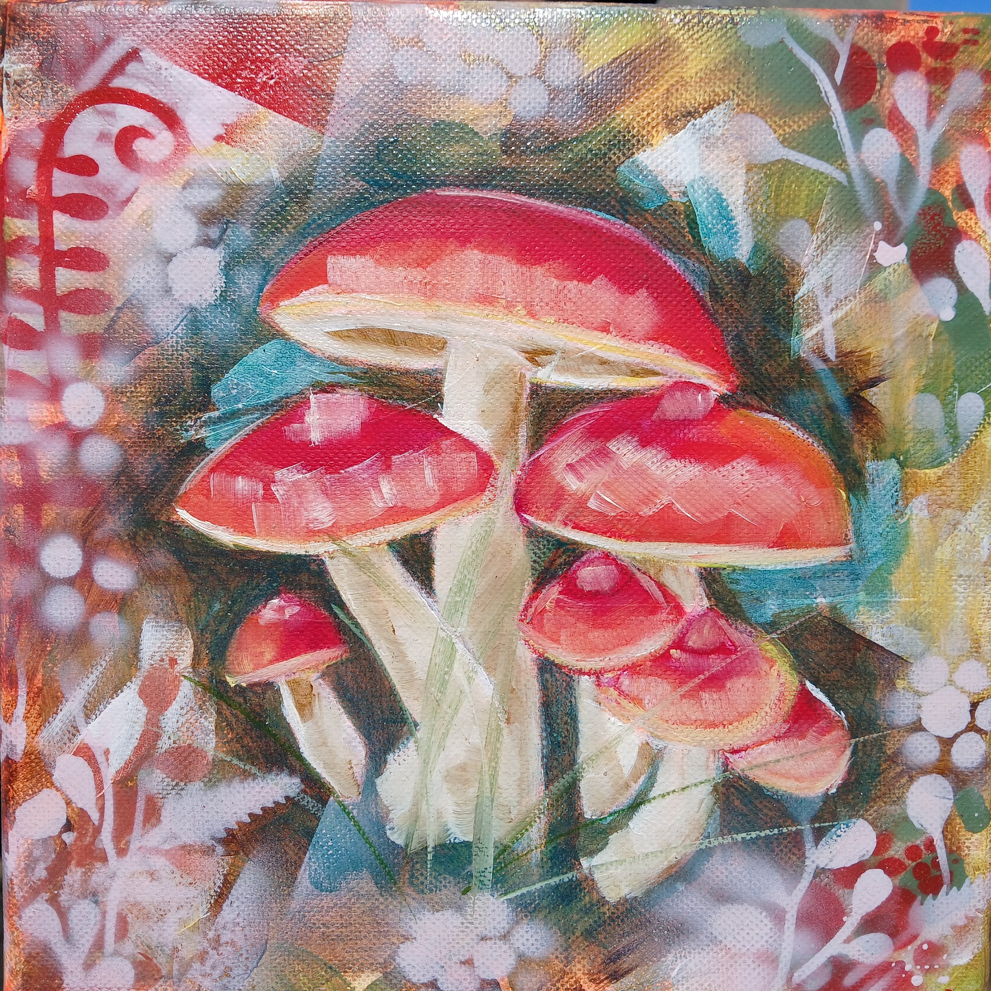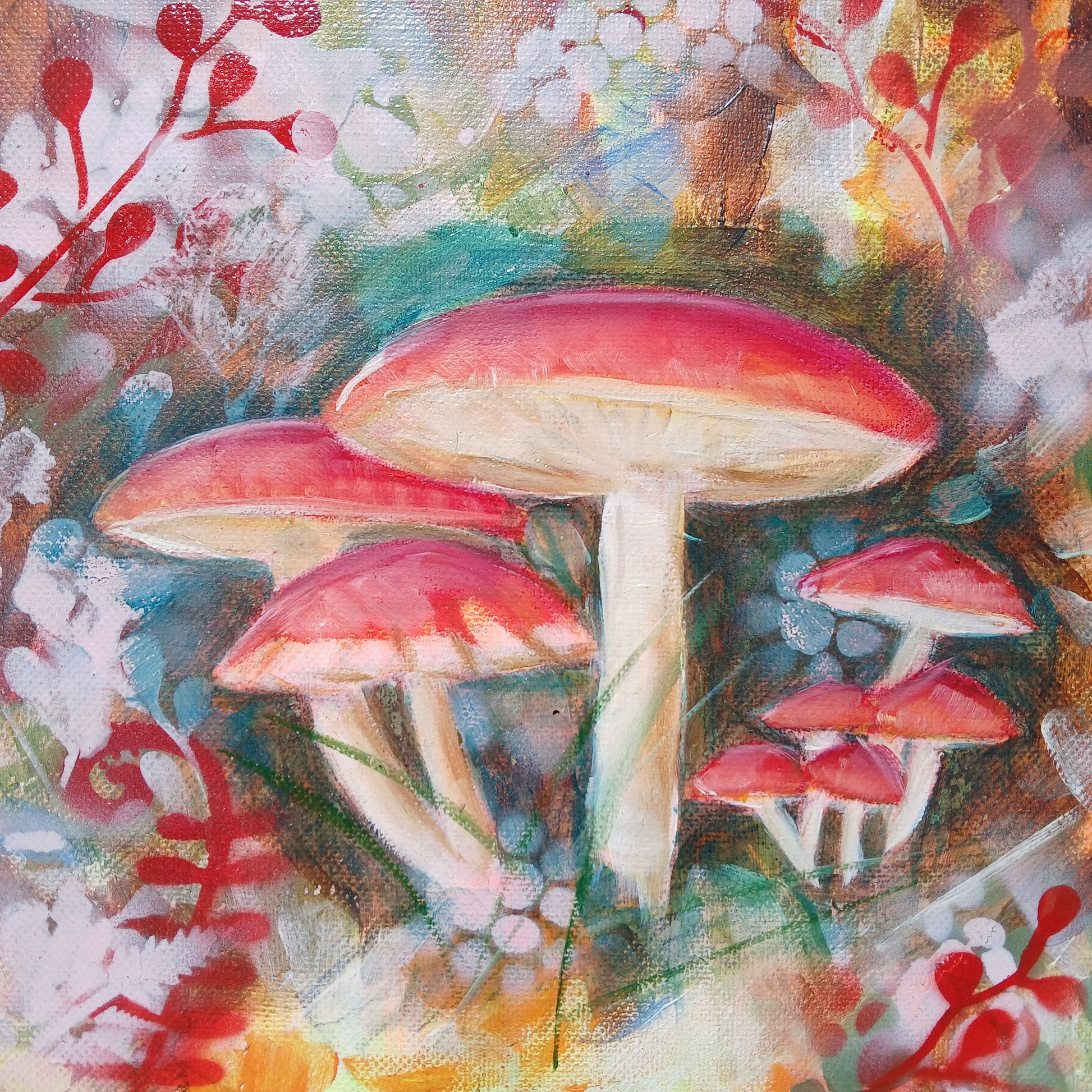Ces petites toiles aux couleurs vives illustre la beauté fragile et fascinante des champignons dans leur habitat naturel. La palette de rouges et d'orangés les met en lumière dans un monde où la nature se déploie en toute simplicité.