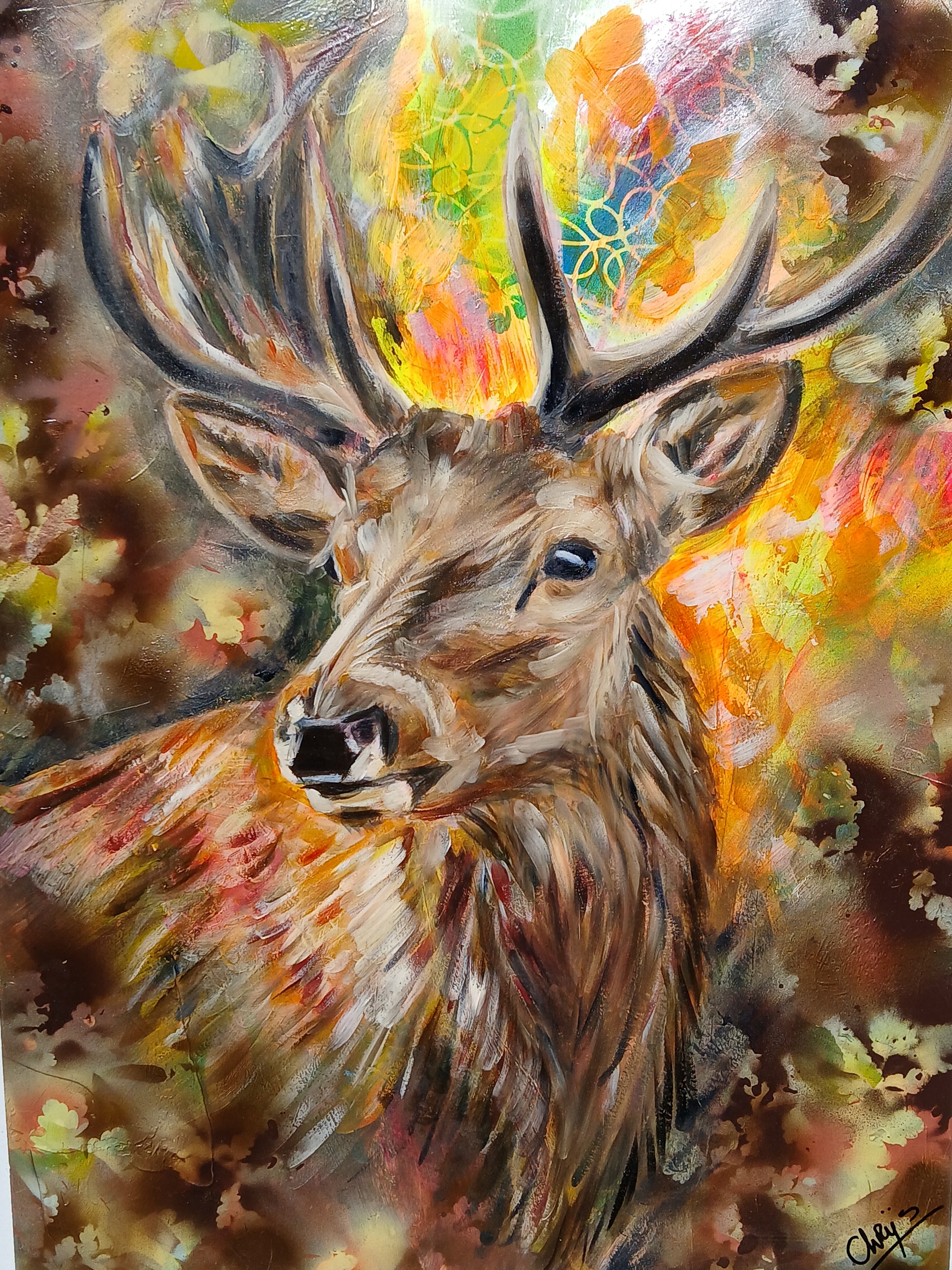 Un cerf majestueux, capturé dans une explosion de couleurs et de lumière. Son regard profond semble nous inviter à nous reconnecter à la sagesse de la nature.
