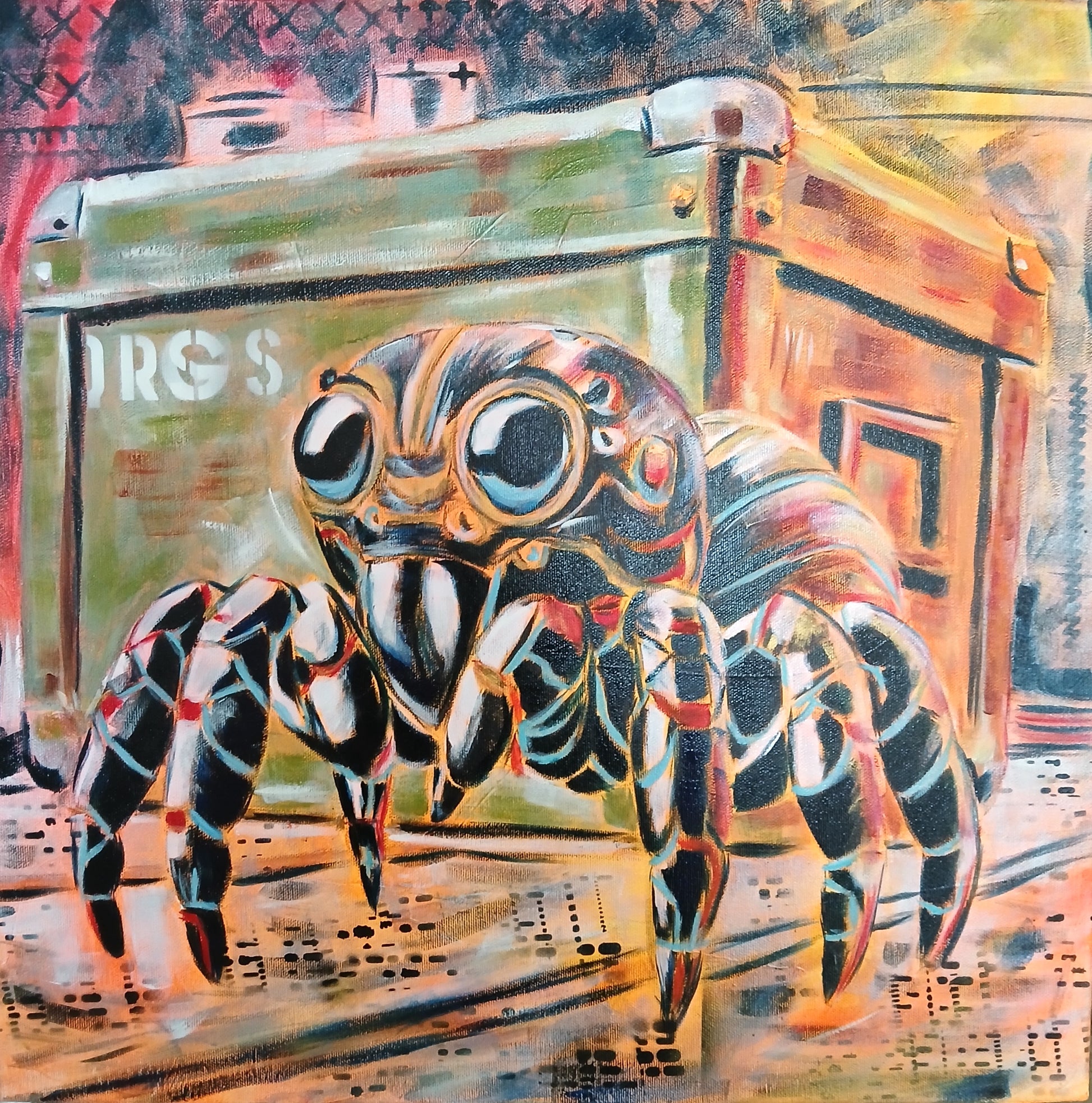 Regard hypnotique, mandibules affûtées et pattes rythmées, Techno Régis débarque d’un futur parallèle où les insectes prennent le contrôle des platines. Son corps métallique aux reflets cuivrés et son décor industriel évoquent un univers dystopique et burlesque, entre Blade Runner et arcade des années 90.